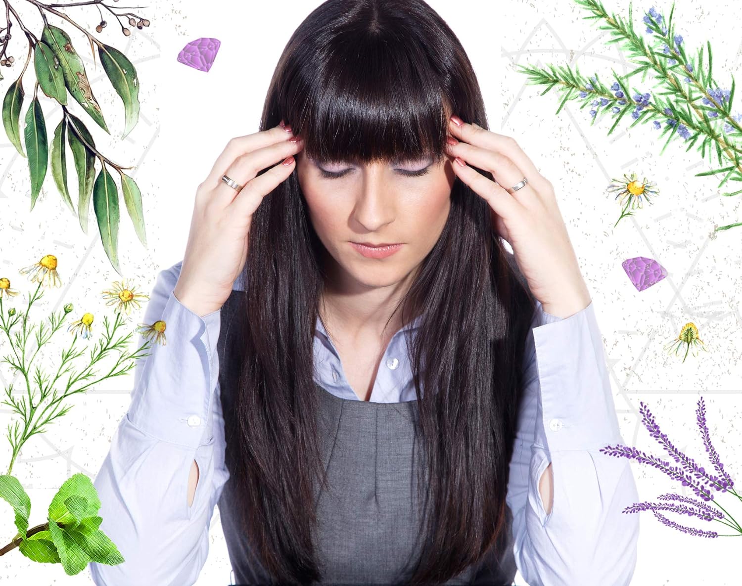 Essential Oil & Amethyst Remedy to Ease Head Pain & Migraine. Camomile, Peppermint, Lavender, Rosemary & Eucalyptus. Aromatherapy & Crystal Rollerball.